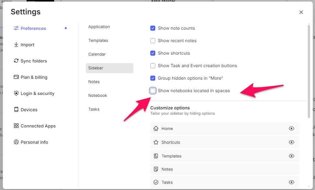 If you head into Settings -> Sidebar -> Show notebooks located in spaces and uncheck it, any notebooks in spaces will not show in the sidebar.