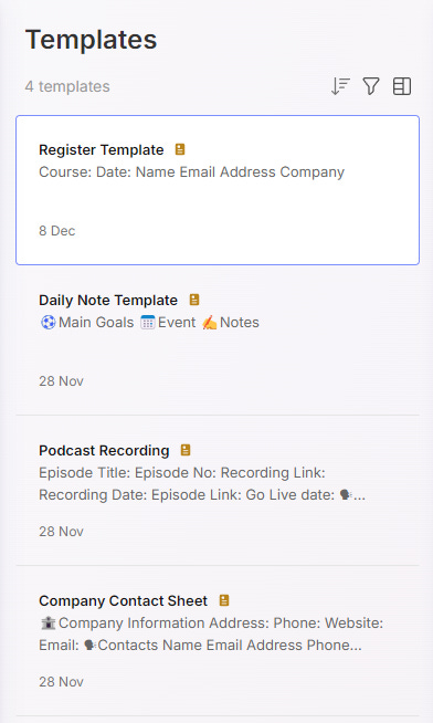 You can click on any of these templates, edit them, change them, do what you want with them, just like you would a normal note. Changes will be saved back to the template.
