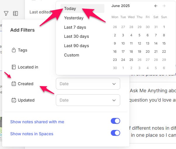 I create lots of different notes in different notebooks every day. How do I see all my notes that I created today in one place so I can review them at the end of each day?