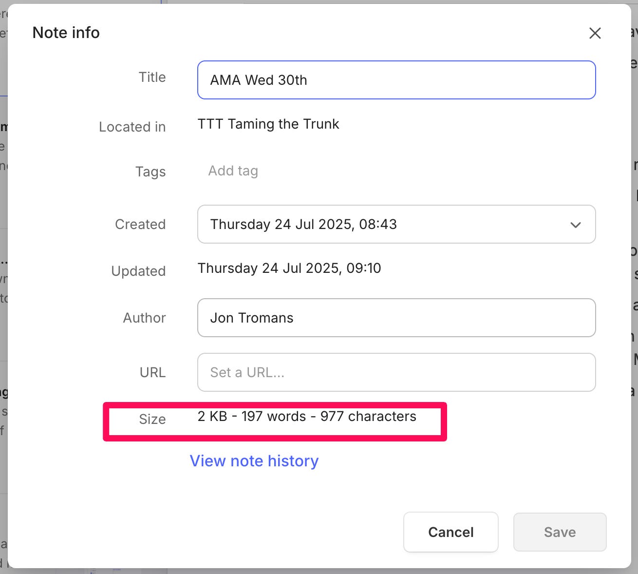Finding the size of an individual note is easy, you can go to the three-dot menu and select note info or use CTRL + SHIFT + I on PCs or ⇧ + ⌘ + I on Mac.