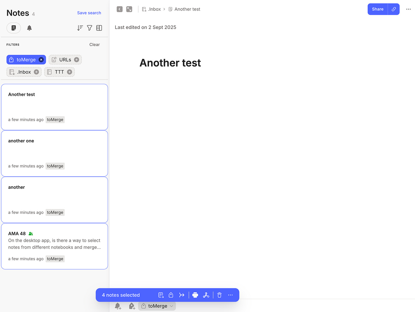 Great question. It’s really easy to just multi-select notes in the same notebook and merge them but trickier if the notes are in different notebooks.