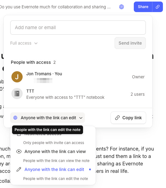 So, if you just want basic collaboration use a share link where folks don’t need an Evernote account.