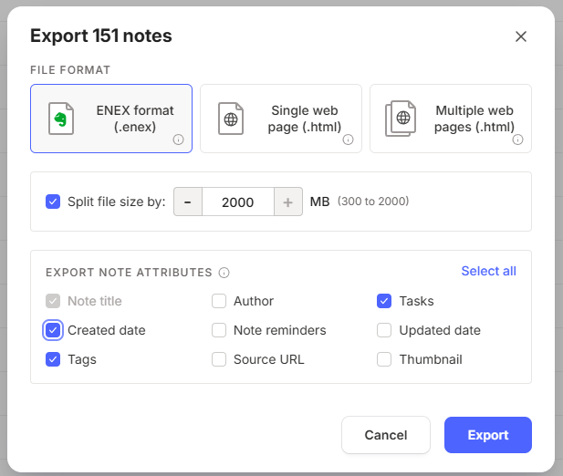 You can split the exported file into chunks if it’s really big and also select the different attributes that appear in each exported note. Things like tags, tasks and reminders.