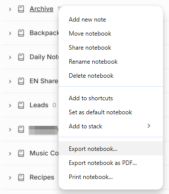 If you want to export your notes, you can right-click on a notebook and select Export notebook and you can export them all.