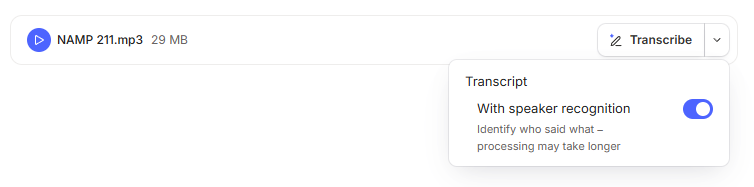 Just click the dropdown arrow on the transcribe button and there’s a toggle to turn off speaker recognition.