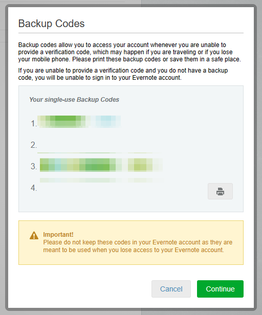 During this process Evernote will give you 10 backup codes and you need to keep these safe and not inside Evernote, preferably inside a password keeper app.