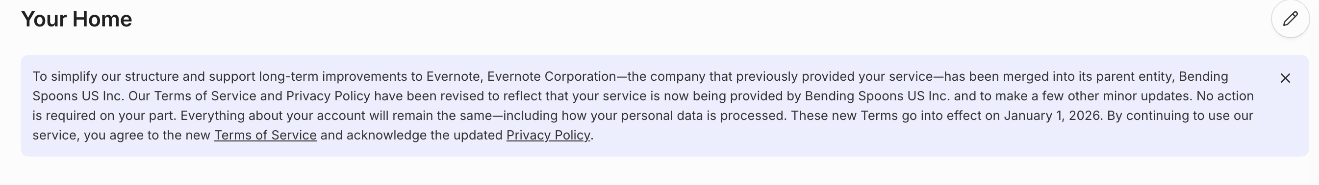 I’ve had a message on my Home page about changes to the Evernote terms and conditions. What does this mean for me? Will it change billing?