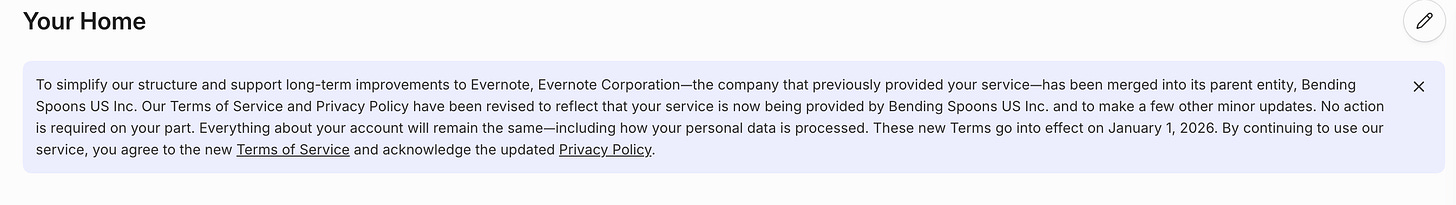At the start of the year a pop up appeared on the Evernote ‘Home’ page with some changes to the terms. This is what it looked like.