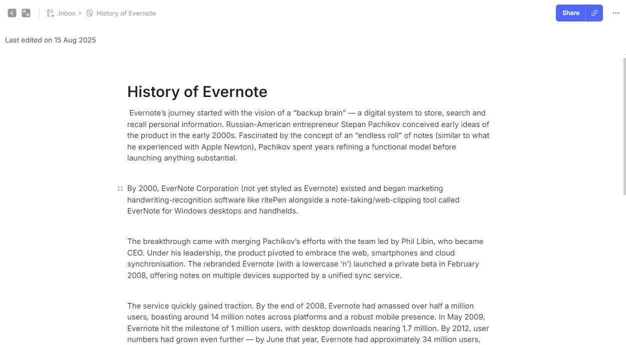 Do some research on the history of Evernote. Write 1000 words and at the bottom summarise the main milestones. Then convert this research into an ENEX file.