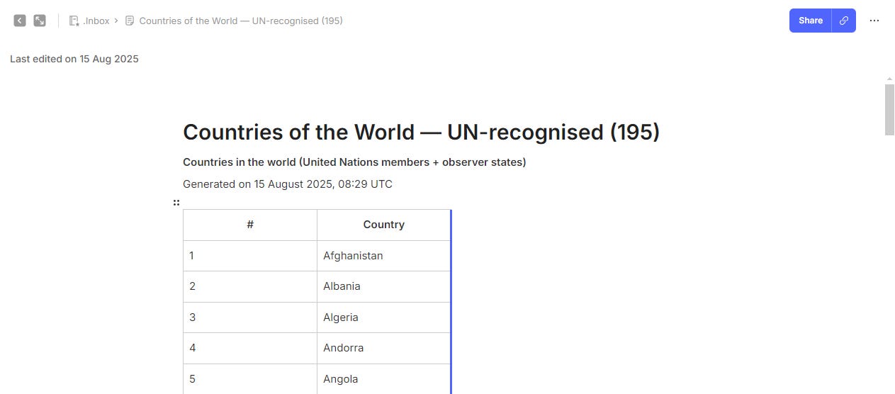 Create an ENEX file with a table of all the countries in the world in alphabetical order.