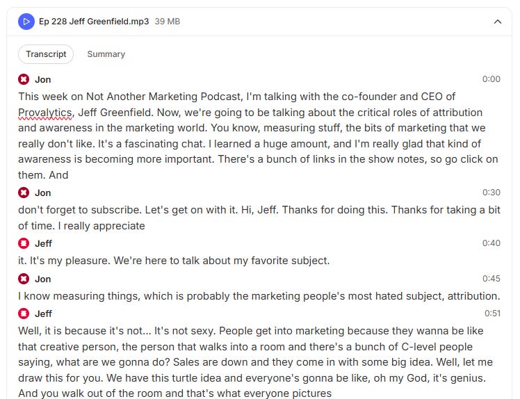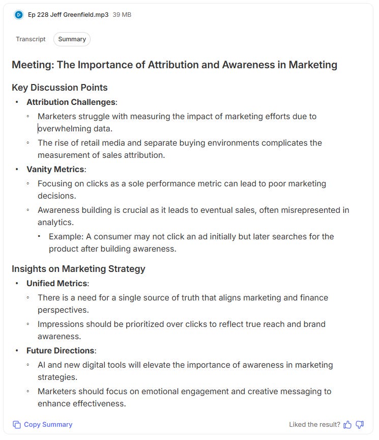 Here’s a summary from a 30 min audio file of my marketing podcast that I transcribed.
