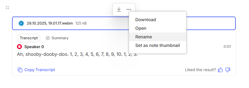 You can access the audio recorder and its options from the Insert menu at the top left of a note or by using the slash (/) command and typing any of the following: