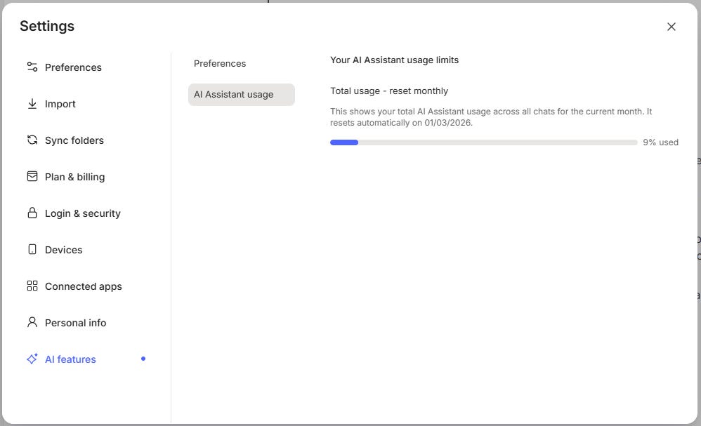Head over to Settings -> AI Features -> AI Assistant Usage and you’ll see how much assistant usage you have left for the month.