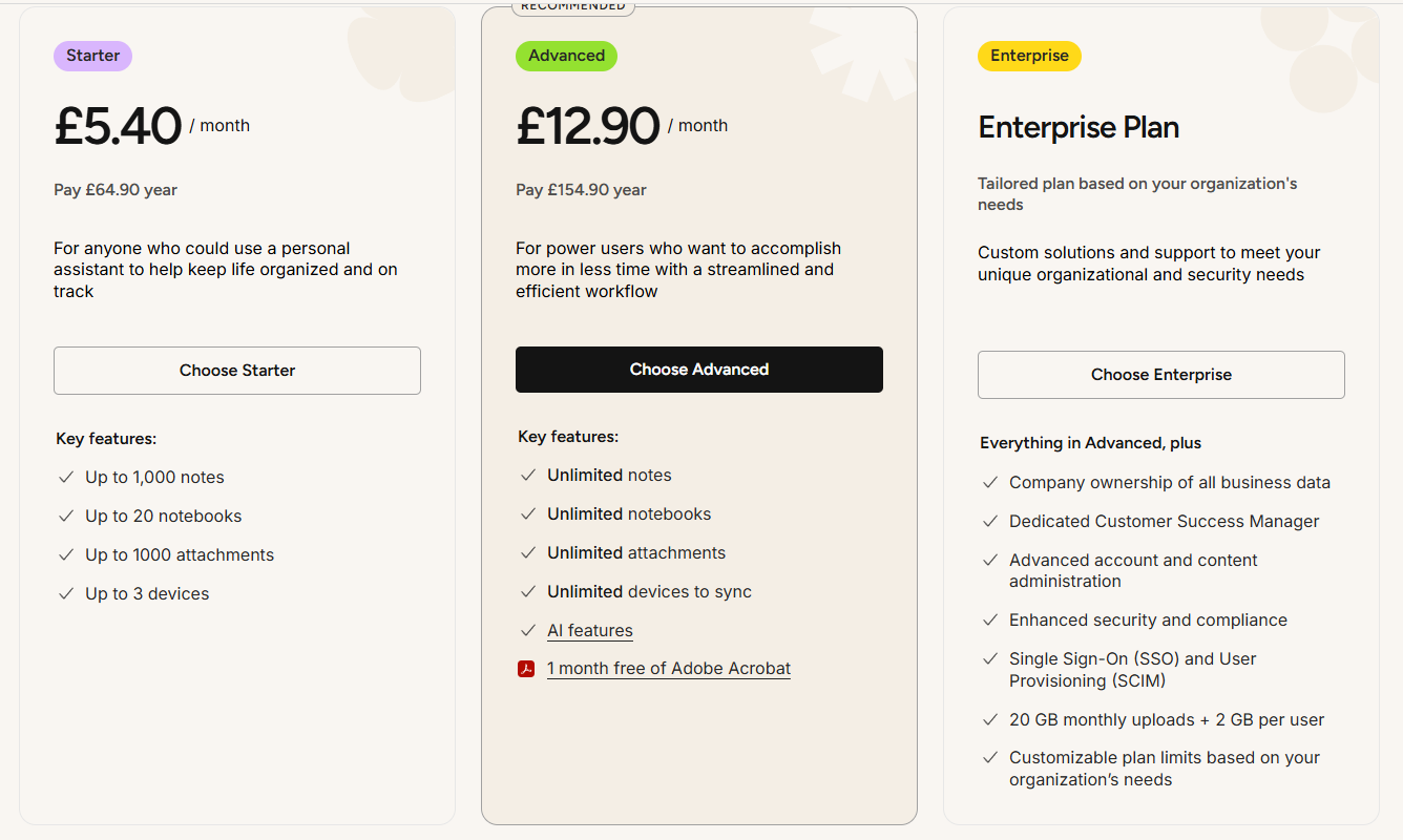 When you compare the prices of Evernotes new Advanced plan with its two main competitors, Notion with AI is £16.50/€19.50/$20 and Obsidian with its own in-built sync over 10GB and no AI is $16/mth.