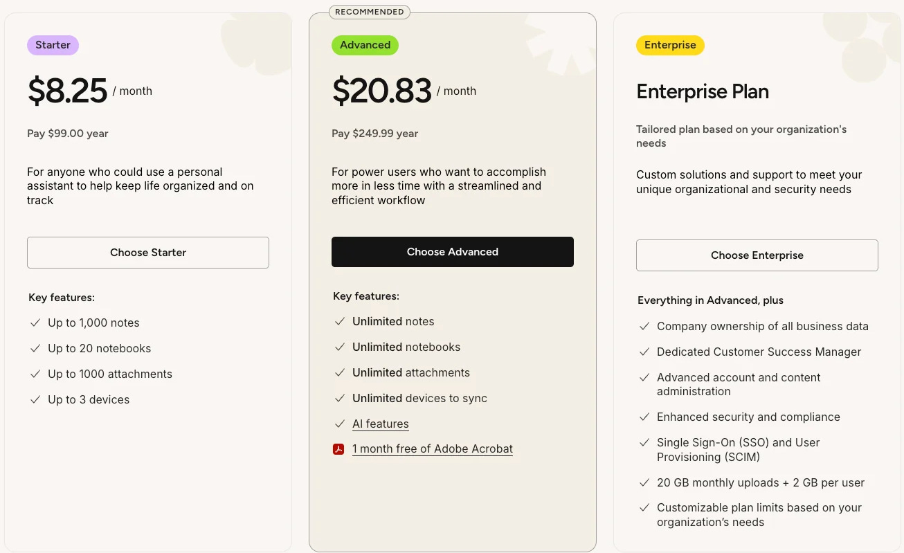 Advanced which gives you unlimited notes, notebooks, spaces, attachments and devices.