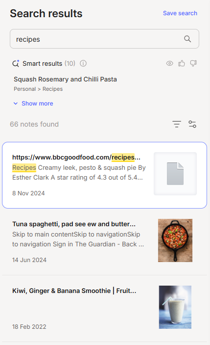 With this search for recipes, the semantic search is at the top and called Smart results and the standard notes are below. It’s still a teeny bit slow but from what I understand this will be improved on again, soon.