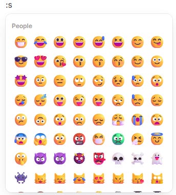 Type a full colon and then start typing the emoji you want and a picker appears.