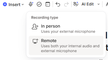 To activate a recording, my muscle memory is going to the microphone icon the the notes formatting bar. You can also use a ‘/’ command or use the insert menu. The microphone seems to be the quickest for me.