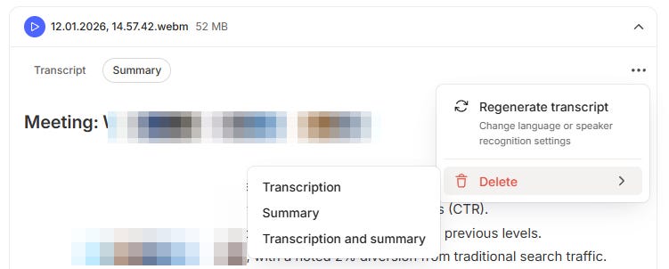 When you’ve transcribed and summarised, you can hit the three-dot menu at the top right of the transcription block and there’s an option to delete.