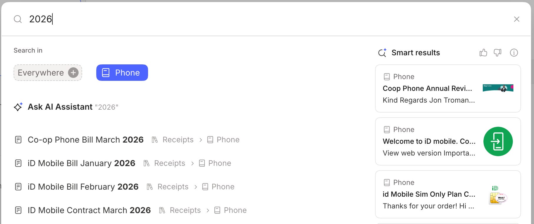 In this example, I’ve just searched for 2026 in my Phone notebook and I get all my phone bills for this year.