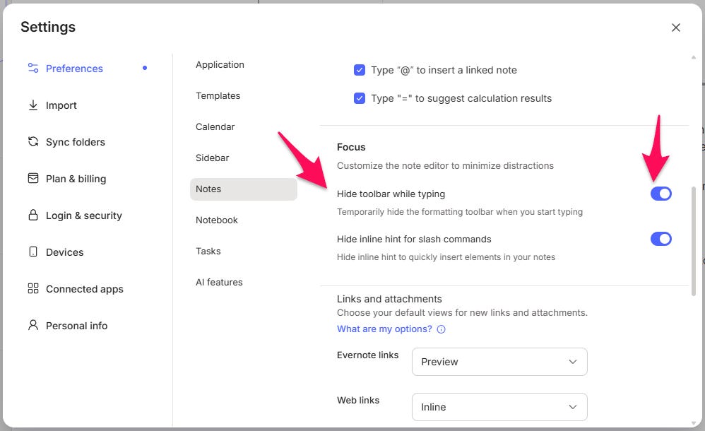 Sixth is my second favourite. We now have a new setting that will hide the header and footer of your note when you are typing.