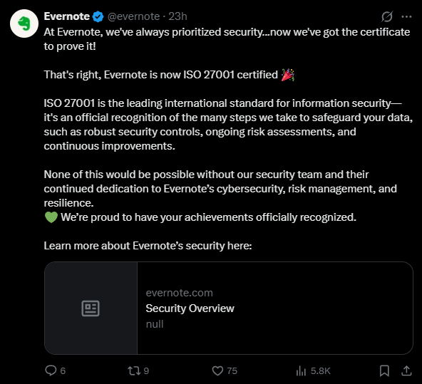 The seventh new thing is Evernote have announced on Xitter that they are now ISO 27001 certified.