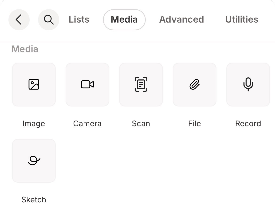 When you edit a note and hit the Insert menu, a new layout slides up offering all the usual items you can add to a note.