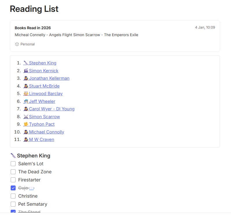 I have a simple reading list. It’s a bunch of authors that I read on a regular basis with checkboxes of their books underneath their names.