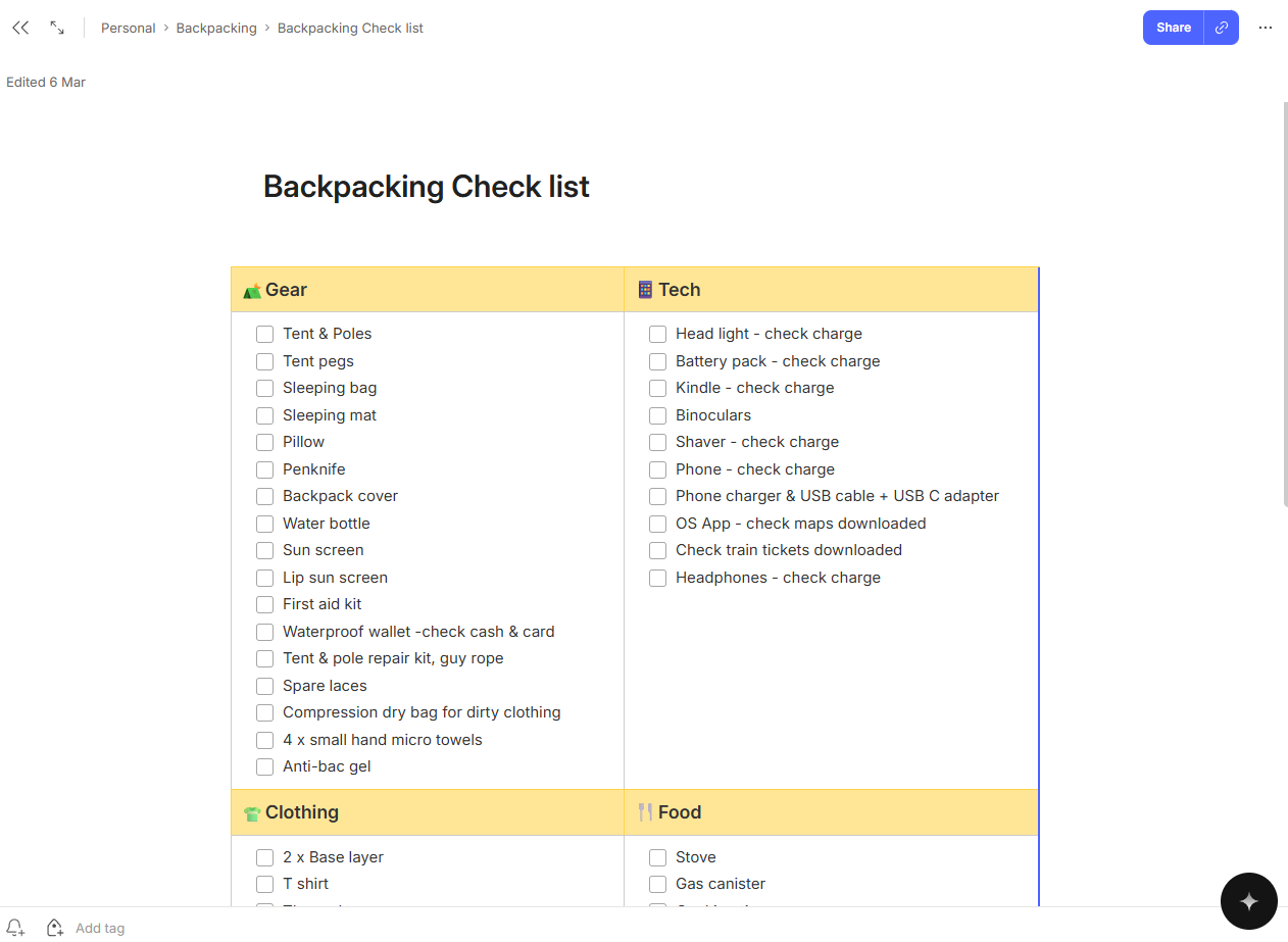Something I’ve found myself doing many times is sitting and starring at a list trying to work out if I’ve missed something off it. Especially with my backpacking list, if I forget my stove I go hungry, or end up at a pub. I should forget my stove more often!