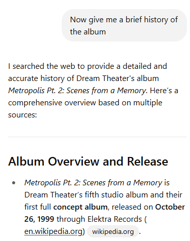 It found the name of the album in the note which is “Dream Theater’s Metropolis Pt. 2: Scenes From a Memory” and it found the track listings.